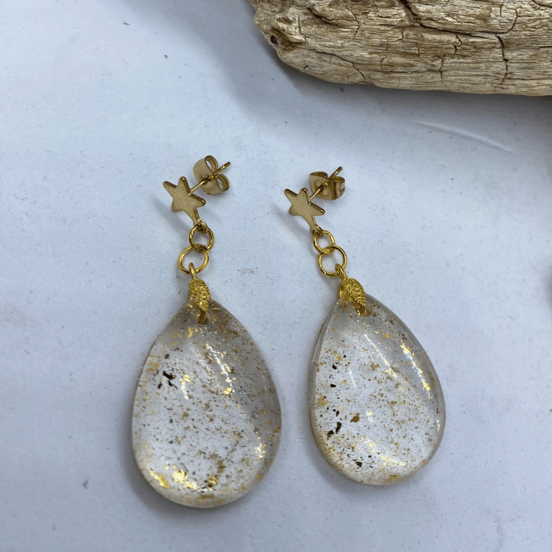 Epoxy handmade jewellery is durable, long-lasting and hard-wearing, so it keeps its appearance for many years, even when worn every day. In addition, the material is lightweight, so even massive epoxy jewellery is comfortable to wear. When you choose to adorn your neck with epoxy earrings, rings or neck jewellery, you’re choosing not only beauty, but also quality. From the first to the last step, from the choice of colours to the moulding of the jewellery, the Starlight jewellery set: earrings and Starlight pendant is created by hand.